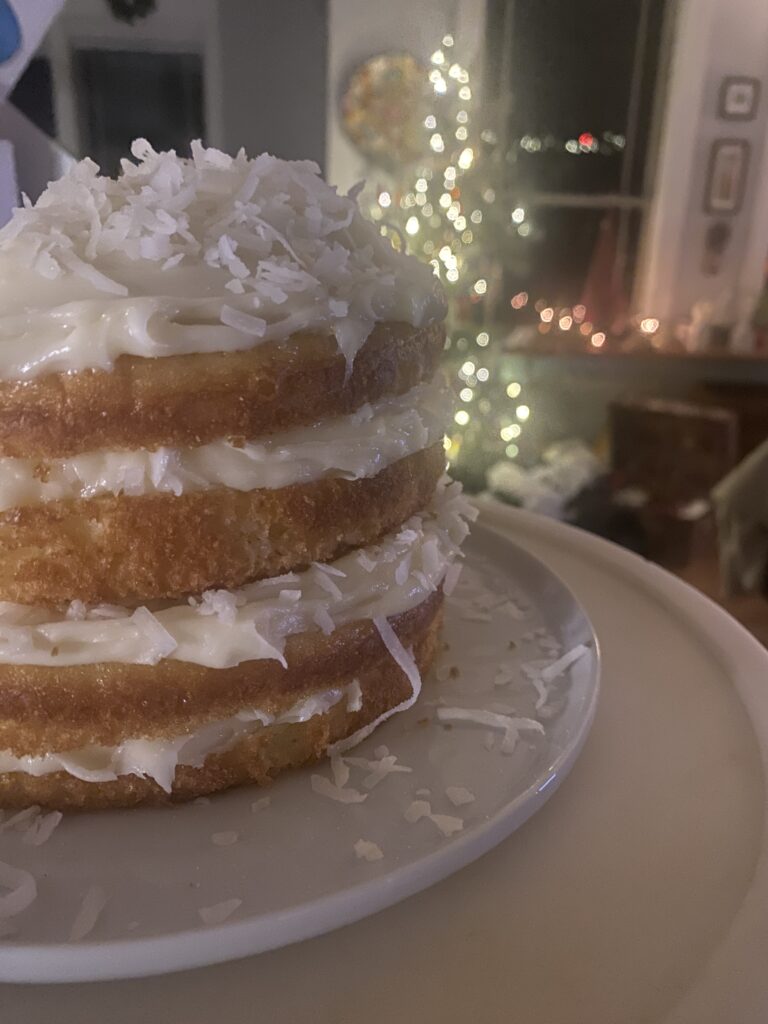 When the cake is completely cooled, prepare the frosting. In a stand up mixer, or using an electric hand mixer, blend together the cream cheese, butter, confectioner sugar, vanilla and salt until smooth. If you want to make multiple layers, slice through the cooled cake rounds horizontally. Place the first round on a cake platter and spread 1/4th of the frosting on the top leaving the sides unfrosted. Shower with 1/4th of the coconut. Repeat the layers. Continue adding each cake round and topping with the frosting. Finish the top layer with the coconut flakes. This cake is fine to be at room temp for 24 hours, but refrigerate after 24 hours.